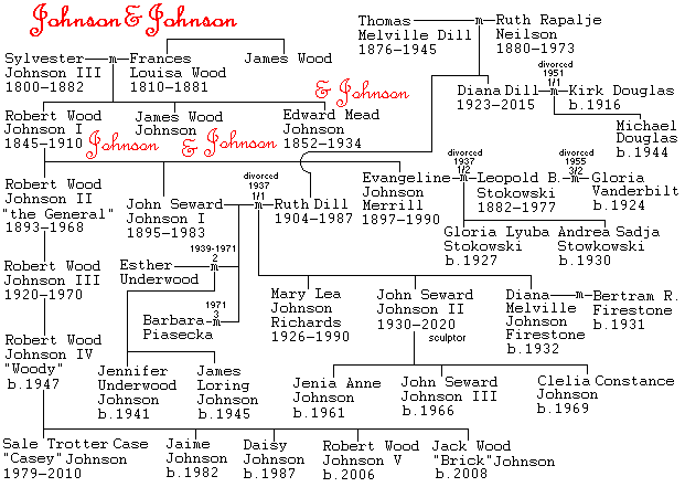 Other connections of interest with the family are, first, that New Brunswick was also an early center of business of Cornelius Vanderbilt, second, that Robert's daughter Evangeline married composer Leopold Stokowski, third, that the first wife of John Seward Johnson I was Ruth Dill, whose sister married actor Kirk Douglas (who was astonished when taken "home" by his wife) and was the mother of actor Michael Douglas (who was actually born in a Johnson house in New Brunswick), fourth, that John Seward founded the Harbor Branch Oceanographic Institution (HBOI), and fourth, that John Seward Johnson II (1930-2020), usually just called "Seward Johnson," after being fired from the family company and working for Harbor Branch, became a famous sculptor and founder of the Grounds for Sculpture museum in Hamilton, NJ.