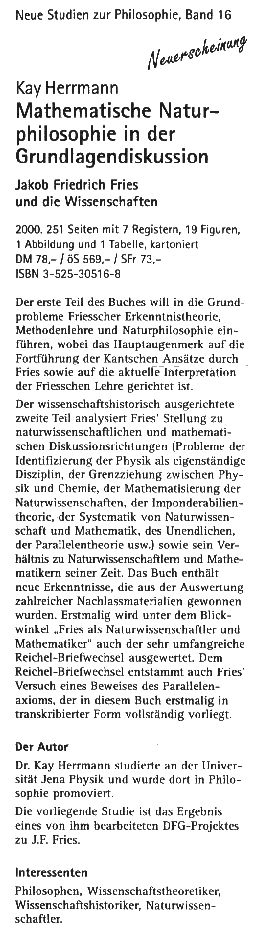 Because Fries thought that the empirical and a posteriori critique was psychological in nature (or "anthropological"), it became commonplace to accuse him of what has been called "psychologism," which we may take to be the doctrine that human knowledge merely reflects the forms of the human mind, the structures that the human psyche imposes upon the world. This accusation entirely failed to take into account the distinction between object language and meta-language, where the psychological, or whatever, nature of the critique would not affect in the slightest the objective character of the object languages, it merely refers to it. So far, only Leonard Nelson has properly understood the implications and success of Fries's theory; and he quickly recognized its affinity to the axiomatic mathematics of David Hilbert, which distinguished between the object languages of mathematics (formalized in axiomatic systems) and meta-mathematical meta-language (which describes the axiomatic systems and considers epistemological and metaphysical questions about them). Nelson's own doctoral disseration demolished the accusations of "psychologism" against Fries by the self-sytled "Neo-Kantians" (such as Wilhelm Windelband) of Nelson's day. Even Karl Popper, otherwise an understanding and sympathetic commentator on Fries, produces his own mistaken accusation of "psychologism," i.e. that some sort of subjective (psychological) certainty is to be attributed to the first principles of the object languages. This would have been true for Hume, but not for Fries, where all mediate knowledge -- the manner in which we formulate propositions in concepts -- is fallible and corrigible. The objective certainty that may belong to first principles in themeselves, as immediate knowledge, is something that we might approach and approximate, but that is no more than what Karl Popper might have said himself.