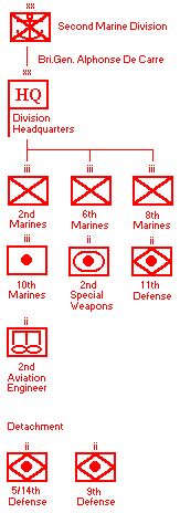 In the organizational diagrams, U.S. Marines are red, U.S. Army green, and Japanese Army orange. Orange was pre-War code color for Japan in U.S. planning. Thus, "Case Orange" was the naval plan for war with Japan, an obsolete and useless plan, as it happened, since it assumed the tactical supremacy of battleships in naval warfare.