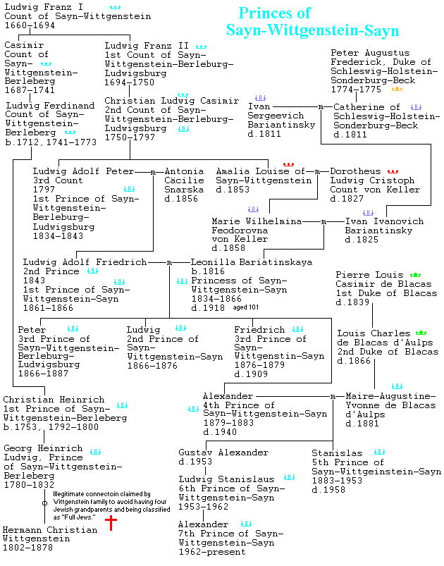 In the diagram, we see where the Wittgensteins claimed that their grandfather Hermann was actually the illegitimate son of a Sayn-Wittgenstein prince. This was from a collateral line of the Princes of Sayn-Wittgenstein-Sayn.