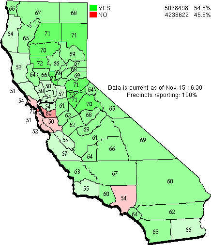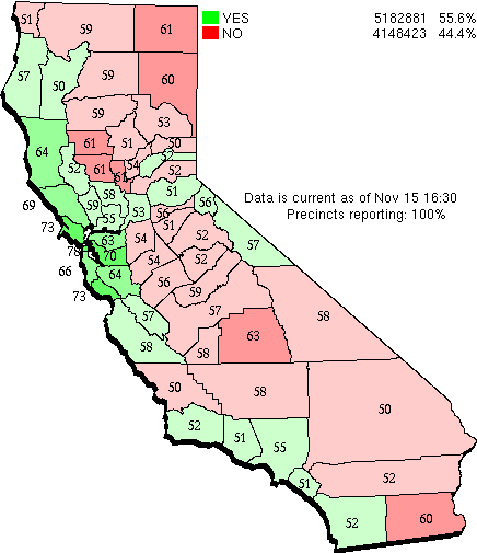 Note that the map for Proposition 215 and that for 209 above are almost mirror images. Counties that went heavily against 209 went heavily for 215. This illustrates the manner in which Libertarian principles cut across the ordinary left-right political spectrum. The political left favors social engineering and thus opposes equality before the law, while the political right favors their own kind of social engineering which denies to individuals, for supposedly moral reasons, control over their own bodies. The interesting asymetry is that opposition to 209 appears to have been more concentrated that support for 215. Few counties actually went against 209, while many counties went against 215, even though 215 got a higher percentage of the vote overall.