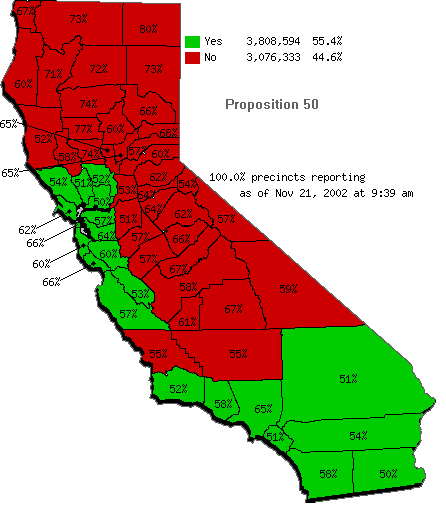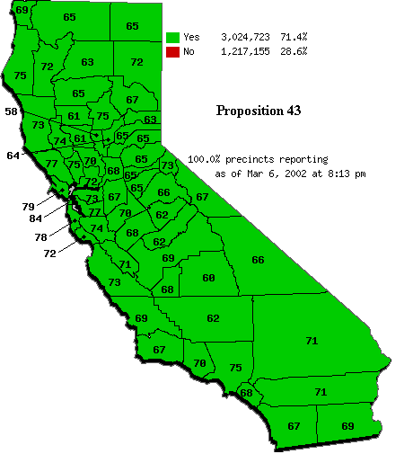 A very solid and widespread victory, except in the far North. So now Arnold will have his money to play with social engineering, like Rob Reiner got money from smokers in Proposition 10 (so that he can tell parents how to be good parents). Meanwhile Gray Doofus is going to cut the education budget, but Arnold has gotten his cut. It is definitely the kind of problem where one doesn't know whether to laugh or cry -- there are plenty of grounds for either.