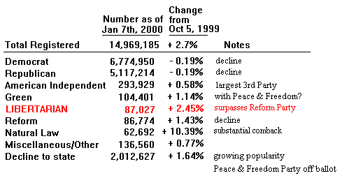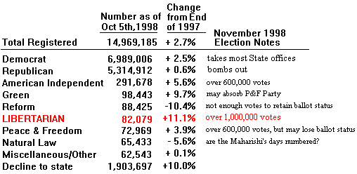 Nevertheless, it fields the largest number of third party candidates, has been growing faster than any party, and it drew the largest number of third party votes in the November 1998 election. In the last figures on registration, the "Natural Law" Party showed strong growth, but this did not make up for absolute losses that it has suffered since 1998, as can be seen by comparison with the chart for 1998 below. The Natural Law Party is actually the party of Transcendental Meditation Guru, the Maharishi Mahesh Yogi. The party's candidates conceal this connection as much as possible, though their actual political program is basically to teach everyone Transcendental Meditation (at public expense). The "American Independent" Party, still the largest "third" party in California, is the descendant of George Wallace's third party campaigns. It is thus, to say the least, very conservative; but many voters who register with it may simply think they are registering "independent." The Reform Party, Ross Perot's