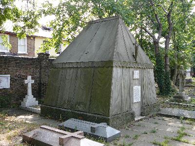 Mortlake is in the south-west part of Greater London, just below a bend in the Thames River. It is on a rail line that is not connected to the London Underground but instead is part of the South West Trains network that originates in Waterloo Station. Richmond, which is accessible from the London Underground, is the second stop west from Mortlake. If one takes the train down from Waterloo, you walk back east along the north side of the track the way the train came. The church is set back from the street a bit, but the works are stone, including the streetside residence, and this distinguishes the structures, even if there were not a conspicuous sign announcing the church and the tomb. A passage to the left of the church, closed by 3:30 on weekdays, leads back to the cemetery. The tent of the Burtons is at first inconspicuous, back around the church to the right.