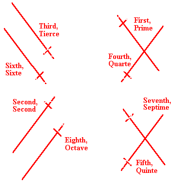 So in facing a right-handed opponent, "outside" is to their left (as in the diagram). Inside is towards the front of the body (ventral), or to the right of a right-handed opponent (as in the diagram). The position of the hand is to be turned palm up, or supinated, or palm down, or pronated. Lying on one's back, you are supine. On one's stomach, prone. So with the right hand rotated counter-clockwise, and the back of the hand up, it is pronated. The diagram then shows the eight possible positions, which have a traditional numbering, which can be used in English, or one can use the Latinate forms of the names, as Pérez-Reverte does. Whether the sword goes up or down from each position is partially a matter of tradition and partly a matter of what is comfortable and natural. In my own instruction, we were really only taught the supinated positions. I don't think that the Third and the Fifth were used much at all, while the Second and Eighth were more or less equivalent. Our basic en guarde postion was in the Sixth, and the basic parry was to move the sword straight across into the Fourth. That would parry most straight lunges to the torso.