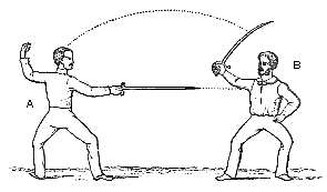 As the diagram shows, A., who delivers point, has an advantage in time and distance over B., who uses edge. Indeed, the man who first 'gave point' made a discovery which more than doubled the capability of his weapon. Vegetius tells us that the Roman victories were owing to the use of the point rather than the cut: 'When cutting, the right arm and flank are exposed, whereas during the thrust the body is guarded, and the adversary is wounded before he perceives it.' Even now it is remarked in hospitals that punctured wounds in the thorax or abdomen generally kill, while the severest incisions often heal... Moreover, the history of the 'white arm' tells us that the point led to the guard or parry proper, and this 'defense with the weapon of offence' completed the idea of the Sword as now understood in Europe. [The Book of the Sword, 1884, Dover, 1987, pp.116-127]