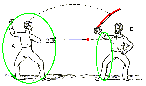 We see, indeed, the vulnerability of the man with the saber, in the green oval, against the other. But the latter is himself exposed, in the green circle, much more so than the former, not, as it happens, to his opponent, but to any attack that comes from elsewhere.