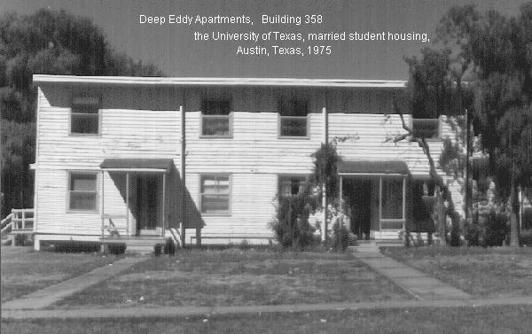 We had a motel reservation and had already lined up an apartment in University married student housing--some place called "Deep Eddy Apartments." The motel was mercifully air continued, but also rather far from either the University or from the housing. The "Austin Motel," indeed, was next door to the Texas State School for the Deaf, whose dormitories were not to open until the next day. So the motel was full of deaf kids, signing away, something I had never seen before nor, in those days before Children of a Lesser God, even heard of. Later, while it was still light, we drove down to Lake Austin Blvd. to find our apartment and get our keys.
