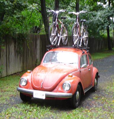 after my retirement in 2009 and some travel around the country. The photo shows him with our bikes mounted on the roof rack. For a couple years he sat in the garage and simply provided me with a car while I was in town. But in the Spring of 2009, my wife's own car died, and so for a while she was been driving Yoda around Princeton until she bought another car. There aren't that many old Beetles still on the road, so he attracted some attention. While sitting at an intersection, I've had a woman shout at me from a passing car, "Love your bug!"
