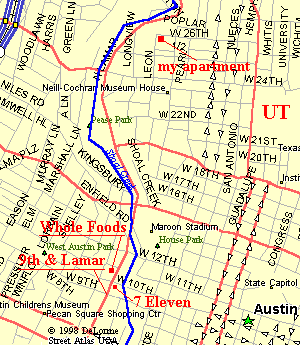 Texas. There had been floods like that in Austin before, but none that bad since near the turn of the century. Flooding on the main river than runs through Austin, the Colorado River (of Texas, not the one of Colorado, Utah, Arizona, and California), had been taken care of in the Depression when a series of dams were built along it, including the dam that makes Town Lake in the middle of the city. But a flood had occurred earlier on Waller Creek, which runs down the east edge of the original city. The flood in 1981 was along Shoal Creek, on the west edge of the original city. There was some speculation afterwards that the urbanization of the Austin area contributed to the flood potential, since water runs off streets easier than off open country. That may have played a part, but it was hard to see the storm itself without expecting something bad to happen, wherever it was going to be.