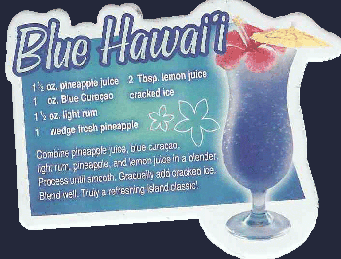 Eventually I did have a Blue Hawai'i on a memorable occasion, one of the first dates with my wife, when we ate at a Chinese restaurant, Ho Toy's, in Sherman Oaks in 1988. It was done up as a proper Tropical drink, with the little umbrella and everything. Nevertheless, it was some years before I ventured to reproduce the drink for myself. This was after my wife and I had been to Hawai'i for our 16th wedding anniversary in 2007. I came away with a refrigerator magnet with a recipe for the drink. So in the end I used the ingredients from both recipes: 1 oz. cream of coconut, 1 oz. blue curaçao, 2 oz. rum, 2 oz. pineapple juice, and 1 oz. lemon juice. This goes into the blender with two full glasses of ice. All blended together, it makes a couple of full drinks. With the cream of coconut, this makes for a very tasty but certainly very fattening drink. So I only make it occasionally. I do think that it is much like the Blue Hawai'i we had at Ho Toy's.