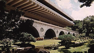 Passing through the bushes at the back of the garden, one would go down into the bed of Mānoa Stream, which usually had running water in it, often quite a lot. That is where I had my first kiss with my first wife. Up behind the stream was the hillside of the St. Louis Heights ridge that enclosed the Mānoa Valley on the south side. The photo at right actually shows the back of Jefferson Hall. The arches along the bottom of the building were right outside the cafeteria, so the view from within was the grassy scene shown. Mānoa Stream would be out of the picture down to the right. Sitting near the windows in the cafeteria, the hillside beyond was itself plainly visible. In the winter, such as it was, the hillside would even be brown for a while. Otherwise it was green. Of course, even in winter, it usually wasn't cold enough for the doors to be closed. It was always just screen doors that closed off one whole side of the long room.