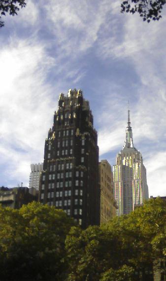 | American Radiator Building, 1924, in foreground, from Bryant Park, New York City, September 2017 |