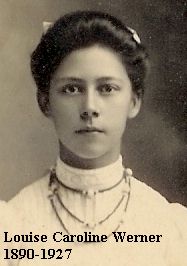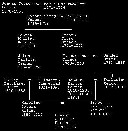 One of my mother's cousins has traced the Werner family in Baden all the way back to 1670. The chart shows the descent of my grandmother Louise from her great-great-great-great grandparents, Johann Werner and Maria Schuhmacher.