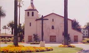 is the now most legendary Silicon Valley, with Santa Clara right in the middle. The Mission, which had moved around a bit, is now encompassed by the campus of Santa Clara University, which is what the Jesuits did with the Mission land when the Church passed it to them. Almost all that remains of the original Mission buildings is a long abode wall. The final Mission church was on the present site, but it burned in 1926 and was reconstructed somewhat more elaborately. What had been painted features on the front of the church now are done in solid relief. Getting there involved a guard again, and a University vistor's pass. No provision was made for tourists at the church site.