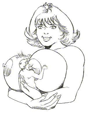 It is even unnerving to many women, who find the idea of an infant, let alone a husband or lover, sucking at her nipples so repellent that the phenomenon of the "bottle-fed" child has been familiar for decades. On the other hand, some women have actually been arrested for "child abuse" just because they breast fed their children for "too long." This constitutes "child abuse," one is left to infer, because long nursing (four years or so) is taken to be unnecessary and unnatural, so that the mother must be prolonging it just because it is sexually arousing for her, which constitures a sexual exploitation of the child. These sick fantasies of the child abuse Nazis at least serve to make this point: The erotic potential of lactation and breast feeding would seem to be great. Lactating breasts usually have swollen up much beyond their ordinary size. A woman who has breasts full of milk has a kind of discomfort and urgency to nurse or express milk that could well be seen analogous to the need of an excited male to ejaculate; and the analogous fluids are both white. Milk, on the other hand, is of its nature suited to ingestion. People drink cow's milk all the time without finding that disturbing, but it is only in very specialized erotica again that one sees anyone drinking human milk, rather than human semen (which is a pornographic staple). One might think of this as rather turned around. So here we have the counter-attack of the female breast, in its full functional glory.