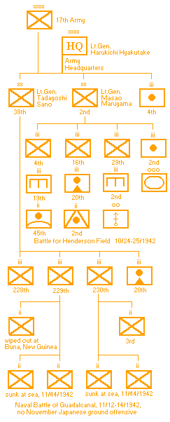 Volume I [Game Marketing Company, Allentown, Pennsylvania, 1981], where units must be found listed under their divisions. Other information on Japanese forces is from John Toland, The Rising Sun [Bantam Books, 1971] and other books in the bibliography. Again, details of the symbols are explained at "Military Rank". Note that non-standard symbols are used for company and platoon. Many small units included for the Japanese simply reflect pieces in the "Bloody Ridge" boardgame, which presumably have been designed to reflect what was available to Japanese forces. Madej does not give details of unit organization for Japanese forces on Guadalcanal, and, indeed, such details may not even be known, considering the attrition suffered in their delivery and the chaotic conditions that prevailed in the command on site. Also, board games rarely provide markers for non-combat support units. Thus, the diagram has been provided at right to show the standard structure of a Japanese triangular division, as detailed by Madej [pp.9-10]. It was not uncommon for mountain artillery to occur as substitutes for field artillery, as we find on Guadalcanal. While anti-tank and mortar units are common in the standard division, we do not see the anti-aircraft units that occurred on Guadalcanal. The standard division employed a great many horses. Although becoming obsolete, these were far from gone in the Japanese Army. I have not, however, heard of any horses ever being landed, used, or observed on Guadalcanal, where their use would have been pointless and their maintenance impossible. Madej's tables do not list quartermaster units. These must have existed, but perhaps were counted as part of the transport regiment.