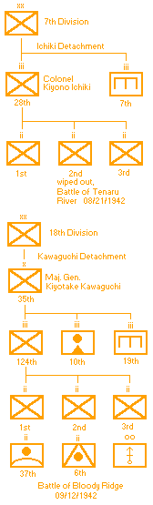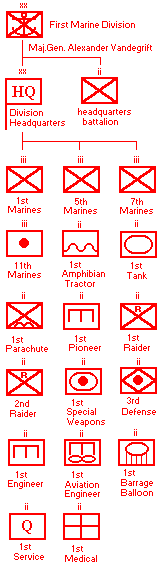 pointed out that Marine units were not listed here. They were not, since I was not providing a complete Order of Battle. Now, however, I regard this as a deficiency and have begun to make up for it. Above left is the organizational chart for the First Marine Division, whose 1st, 5th, and 11th Marines were the first to land on Guadalcanal. The 7th Marines arrived in September. This is based on W. Victor Madej, U.S. Army and Marine Corps Order of Battle, Pacific Theater of Operations, 1941-1945, Volume I [Game Publishing Company, Allentown, Pennsylvania, 1984, pp.137-138]. The detail of supporting units is as Madej gives them. An attempt has been made to match special units with the symbols used in "Bloody Ridge." Note that Marine regiments are simply identified as "Marines," not as "Infantry" or "Artillery" as in the U.S. Army.