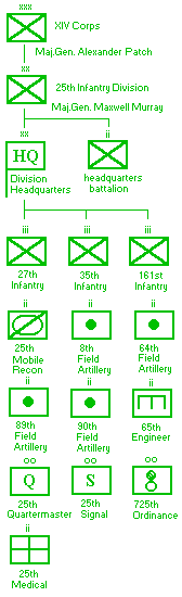 In November 1942, when the Japanese Army gave up hope of retaking Guadalcanal, and the Japanese Navy ceased trying to send reinforcements, the bloodied First Marine Division was withdrawn. Meanwhile, the 164th Infantry and the 2nd Marine Division had arrived. These were elements of the Americal Division of the U.S. Army and the Second Marine Division. Subsequently, other units of these divisions and of the 25th Infantry Division were rotated onto the island. Organizational charts for the Second marine Divison and the 25th Infantry Divison are given left and right, based on the same sources as the charts above. In December 1942, the Army command at Guadalcanal was designated the XIVth Corps, and General Patch of the Americal Division was promoted to Corps Commander. General Sebree then became the commanding officer of the Division. The Second Marine Division chart seems deficient in support units, but this is how W. Victor Madej gives it. The fighting recounted in the books and movies detailed below mainly involves these later arriving forces.