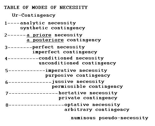 This table summarizes for convenient reference the results of various discussions in the text on necessity and contingency. See especially §§ "Necessity: Formal and Synthetic," Necessity: Material," "Time and Causation," "The Varieties of Purposive Value," and the sections on individual value object languages, such as "Love and Hate."
