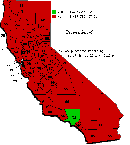 Term limits keep the professional politicians out of permanent power. I would be willing to countenance some modification of them, as described in "A Modest Proposal: Separation of Lawyers and Politics." Proposition 45, however, is supported by the wrong people. When the professional politicians are themselves hot on the scent, it gives the wrong smell to the whole business. I'm not for giving them a chance. Next thing, Willie Brown will be back in the Assembly. If the voters of San Francisco are stupid enough to keep him as Mayor, that's fine (though the Los Angeles Times has said that many San Francisco voters don't think their votes get counted -- ballot boxes have ended up in the Bay!). I don't have to live there. But let's limit the damage. No on 45!
