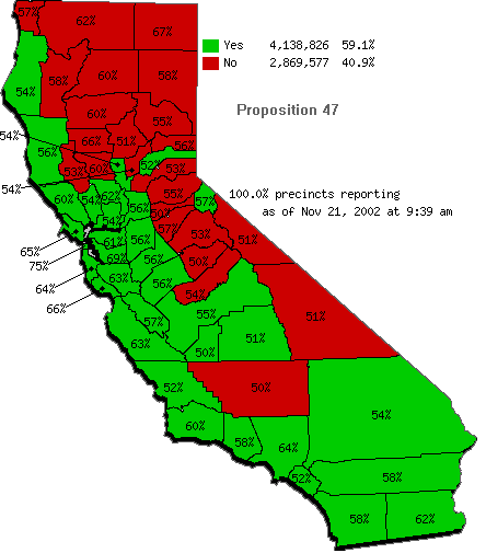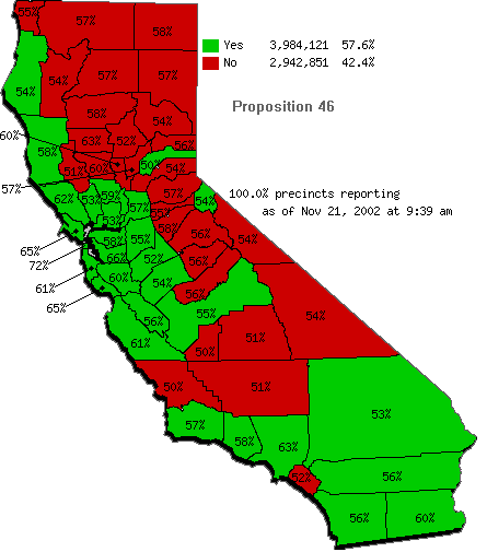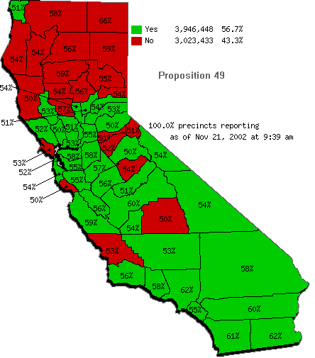 A very solid and widespread victory, except in the far North. So now Arnold will have his money to play with social engineering, like Rob Reiner got money from smokers in Proposition 10 (so that he can tell parents how to be good parents). Meanwhile Gray Doofus is going to cut the education budget, but Arnold has gotten his cut. It is definitely the kind of problem where one doesn't know whether to laugh or cry -- there are plenty of grounds for either.