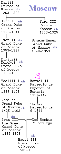 Much of the information here comes from Royal Families of Medieval Scandinavia, Flanders, and Kiev, by Rupert Alen and Anna Marie Dahlquist [Kings River Publications, Kingsburg, California, 1997], Kingdoms of Europe, by Gene Gurney [Crown Publishers, New York, 1982], a chart, Kings & Queens of Europe, compiled by Anne Tauté [University of North Carolina Press, 1989], The Penguin Historical Atlas of Russia, by John Channon with Robert Hudson [Viking, 1995], the Erzählende genealogische Stammtafeln zur europäischen Geschichte, Volume II, Part 2, Europäiche Kaiser-, Königs- und Fürstenhäuser II Nord-, Ost- und Südeuropa [Andreas Thiele, R. G. Fischer Verlag, Part 2, Second Edition, 1997], and Brian Tompsett's Royal and Noble genealogy. For the Tsars, there is the elaborate Chronicle of the Russian Tsars, by David Warnes [Thames and Hudson, 1999]. A discussion of general sources is given under Francia. This page continues and supplements the material in "Rome and Romania, 27 BC-1453 AD" and "The Ottoman Sultāns, 1290-1924 AD".