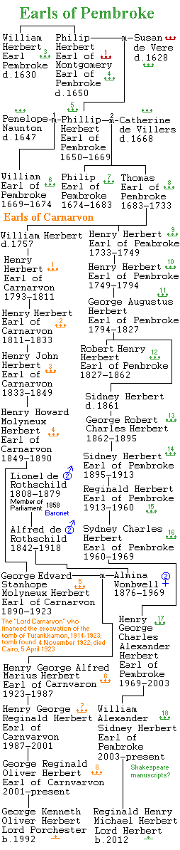 King Charles II of England had no legitimate children, i.e. no children with his Queen, Catharine of Braganza (who was troubled with stillbirths and miscarriages). Nevertheless, the King had many children, by no less than seven mistresses, starting with Lucy Walter. The eldest child was even a son, James Crofts, whom he made Duke of Monmouth after the Restoration, in 1663. The diagram shows two other mistresses and a living line of descent from each of them. Charles fathered five or six children on Barbara Villars, Duchess of Cleveland, who later became involved with John Churchill, the 1st Duke of Marlborough (her sixth child may have been Churchill's). Barbara's children took the surname Fitzroy, Norman French for "son of the king" (Latin filius regis). Her son Henry was made the 1st Duke of Grafton. Today we have the 11th Duke. Nell Gwynne (or Gwynn, Gwyn) was a popular actress who bore Charles two children. Her children took the surname Beauclerk. Her eldest son Charles was made the 1st Duke of St. Albans. Today we have the 14th Duke. Since Charles married Diana de Vere, the daughter of the 20th Earl of Oxford, the Beauclerks are all descendants of the de Veres -- recent generations have begun using the name; and "Aubrey," also an Oxford name, has been occurring. The present Dukes of Bucclech, Grafton, and St. Albans all have living grandsons, as shown; and, apart from the little detail of the illegitimate origin of the families, they are, of course, Stuarts.