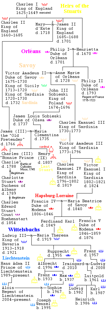 After the Viking era, Scandinavia rarely intrudes into the large events of European history. A spectacular exception was Gustavus' daughter Christina (Kristina), the last of the House of Vasa, is best known for her learning, inviting people like René Descartes to her court. Unfortunately, the climate and Christina's early morning habits, distruptive to Descartes, resulted in his death from pneumonia (d.1650). Whether or not she felt guilty over this, she wearied of ruling and soon abdicated the throne (1654), joining the select company of rulers over the centuries to retire from their jobs. The throne passed to her cousin, Charles X of the Palatinate. His grandson, Charles XII, the "Madman of the North," revived Swedish military fortunes and then saw them catastrophically collapse when he was defeated far inside Russia by Peter the Great at Poltava (1709). Charles' army disintegrated, and he was so far from any base that he had to escape as a refugee south to Turkey, making his way home by sea. After this extraordinary odyssey, he ended up killed in battle. This was the end of Sweden's great military adventures. While the recent Kings of Sweden have all been of the House of Bernadotte, with no connection shown to earlier Swedish Kings, they nevertheless descend, like the previous Swedish dynasty, from the Margrave Frederick VI of Baden-Durlach -- actually by two different routes -- and so from the previous Palatine and Vasa dynasties. This can be examined on a separate popup. Eugene de Beauharnais (on the popup, the father-in-law of Oscar I) was the son of Josefine de la Tascher de la Pagerie, the wife of Napoleon Bonaparte, by her first marriage, to Alexander Francis, Viscount de Beauharnais (d.1794). He was adopted by Napoleon and well married, to a daughter of Maximilian I of Bavaria. My thanks to Leon Pereira, O.P., for drawing these connections to my attention and supplying the information, which has been confirmed and expanded using Andreas Thiele.