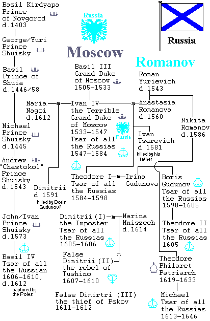 Much of the information here comes from Royal Families of Medieval Scandinavia, Flanders, and Kiev, by Rupert Alen and Anna Marie Dahlquist [Kings River Publications, Kingsburg, California, 1997], Kingdoms of Europe, by Gene Gurney [Crown Publishers, New York, 1982], a chart, Kings & Queens of Europe, compiled by Anne Tauté [University of North Carolina Press, 1989], The Penguin Historical Atlas of Russia, by John Channon with Robert Hudson [Viking, 1995], the Erzählende genealogische Stammtafeln zur europäischen Geschichte, Volume II, Part 2, Europäiche Kaiser-, Königs- und Fürstenhäuser II Nord-, Ost- und Südeuropa [Andreas Thiele, R. G. Fischer Verlag, Part 2, Second Edition, 1997], and Brian Tompsett's Royal and Noble genealogy. For the Tsars, there is the elaborate Chronicle of the Russian Tsars, by David Warnes [Thames and Hudson, 1999]. A discussion of general sources is given under Francia. This page continues and supplements the material in "Rome and Romania, 27 BC-1453 AD" and "The Ottoman Sultāns, 1290-1924 AD".