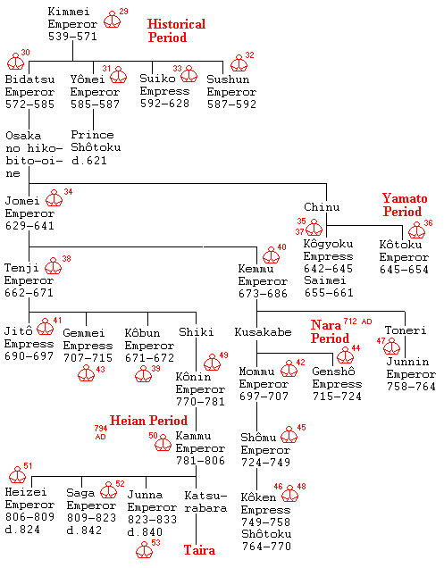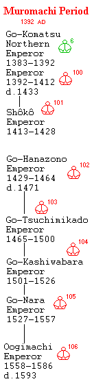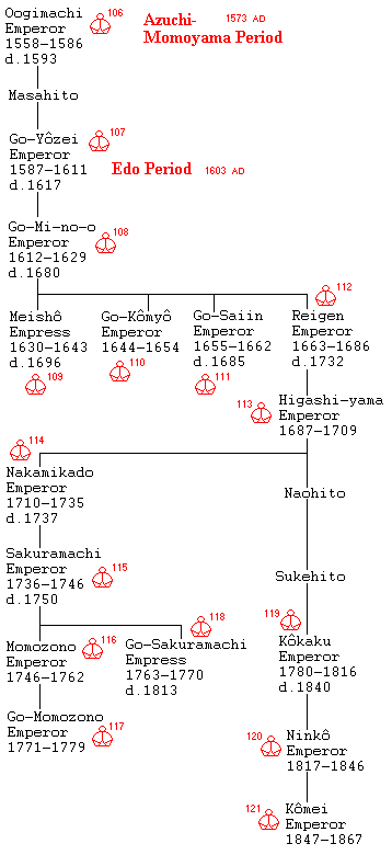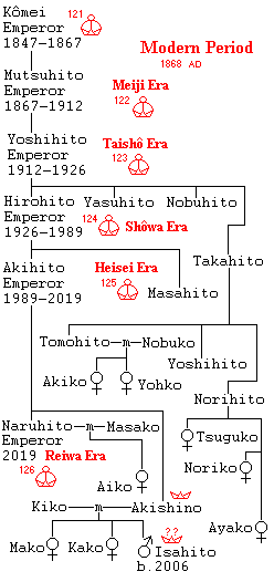 | 122 Mutsuhito | 1866- 1912 | Meiji![]() ![]() 1868 |