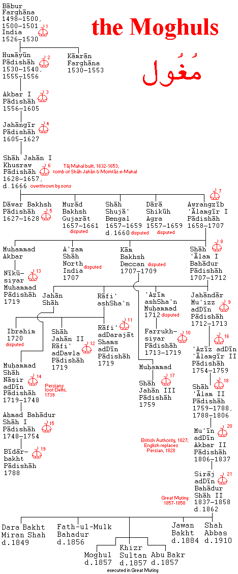 Because of this, even the dating of the Mauryas and the Guptas, the best known pre-Islâmic periods, displays small uncertainties. The rulers and dates for them here are from Stanley Wolpert's A New History of India [Oxford University Press, 1989], the Oxford Dynasties of the World by John E. Morby [Oxford University Press, 1989, 2002], and Bruce R. Gordon's Regnal Chronologies. Gordon had the only full lists I'd ever seen for the Mauryas, Kushans, and Guptas until I found the Oxford Dynasties, which has the Mauryas and Guptas but nothing else until the Sulṭanate of Delhi. Besides Wolpert, another concise recent history of India is A History of India by Peter Robb [Palgrave, 2002]. It is becoming annoying to me that scholarly histories like these are almost always but poorly supplemented with maps and lists of rulers, let alone genealogies (where these are known). Both Wolpert and Robb devote much more space to modern India than to the ancient or mediaeval country, and this preference seems to go beyond the paucity of sources for the earlier periods.
